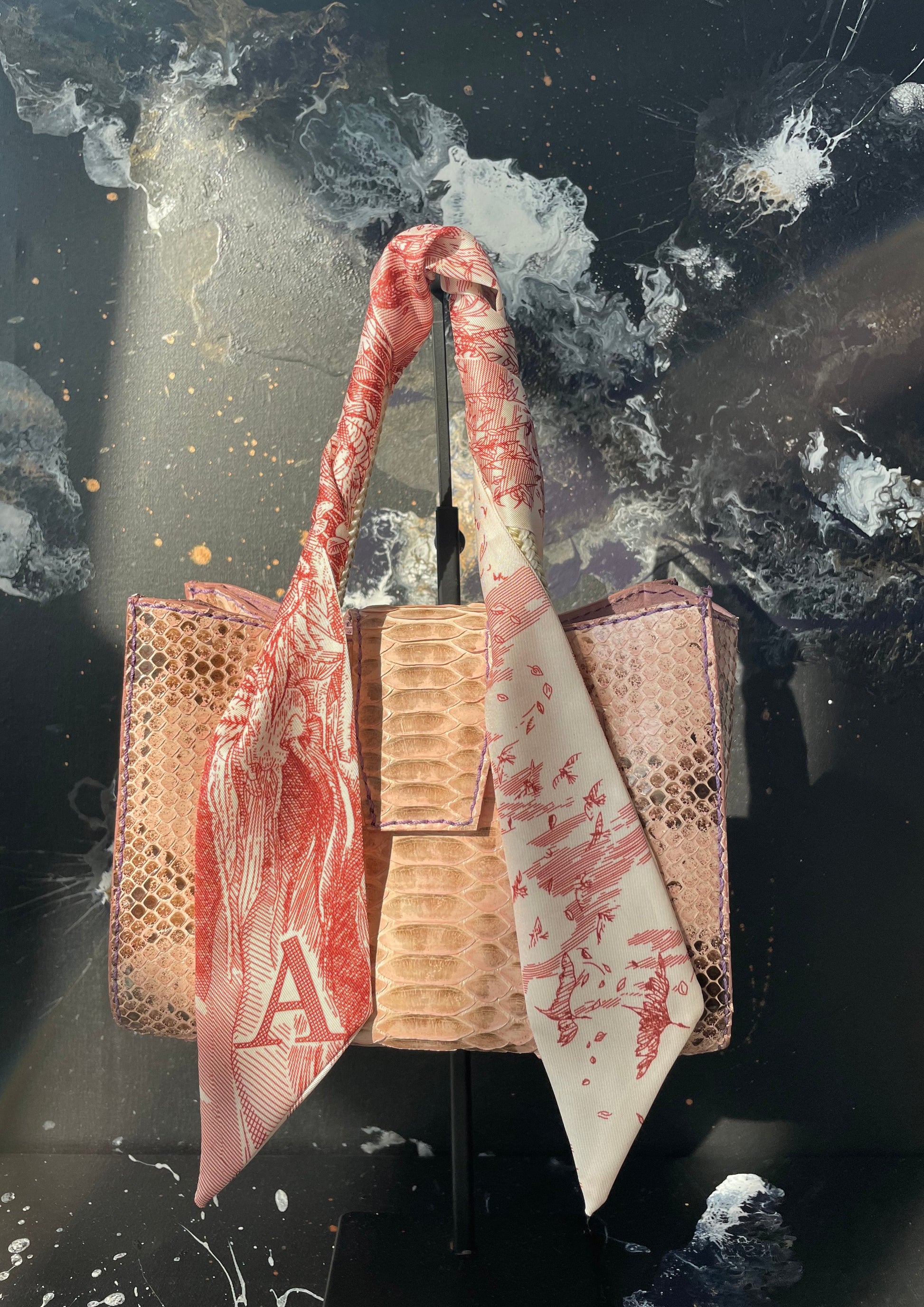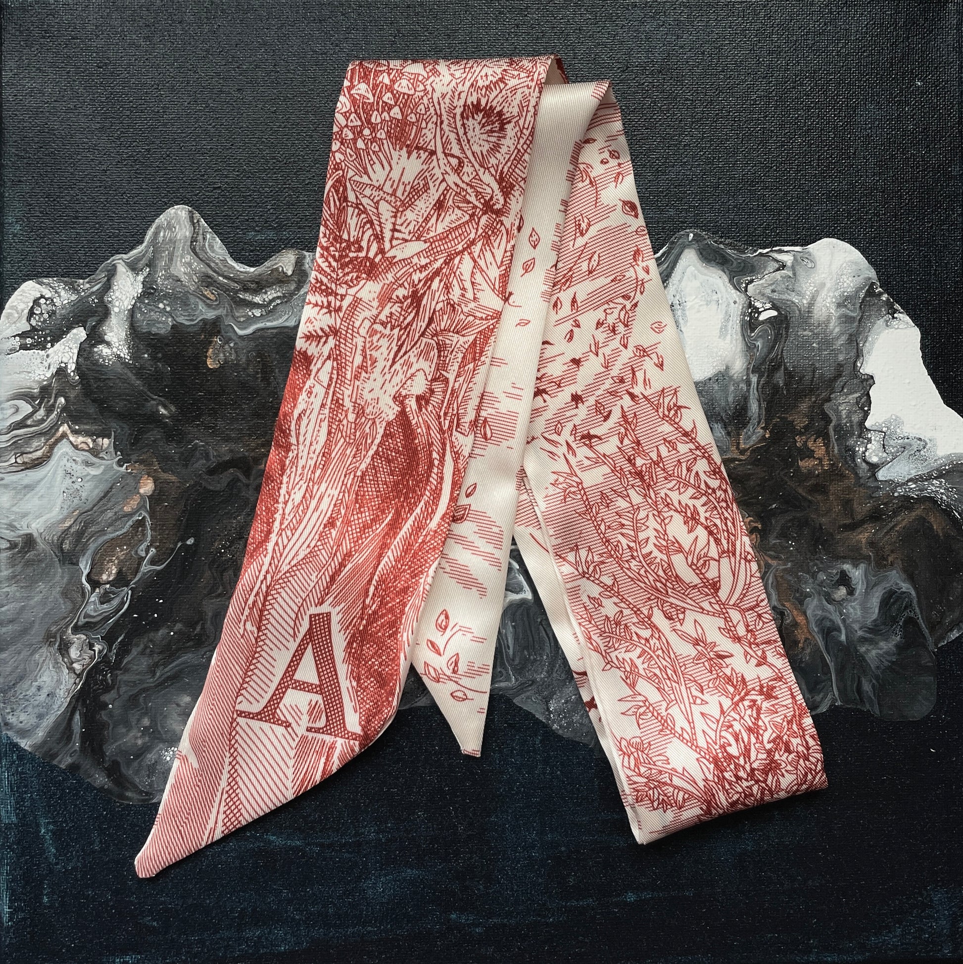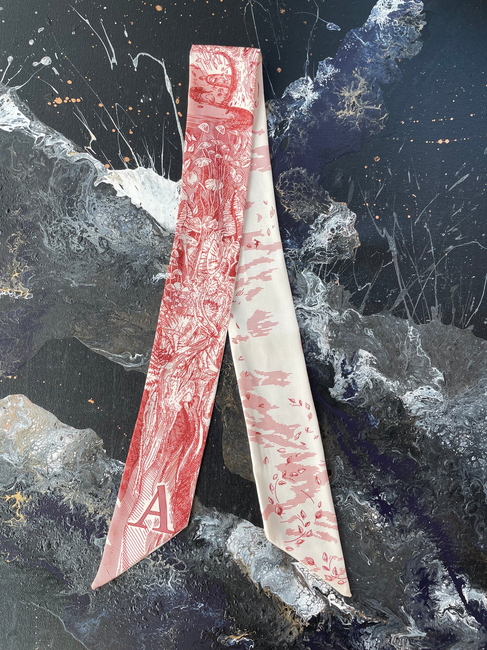 TWILLY, elongated shape, pointy ends, finished with an initial. Perfect little fashion accessory to wrap around the handle of your handbag, tie it around the neck Parisian style or just make a pretty bow. Whimsical art design in red.
