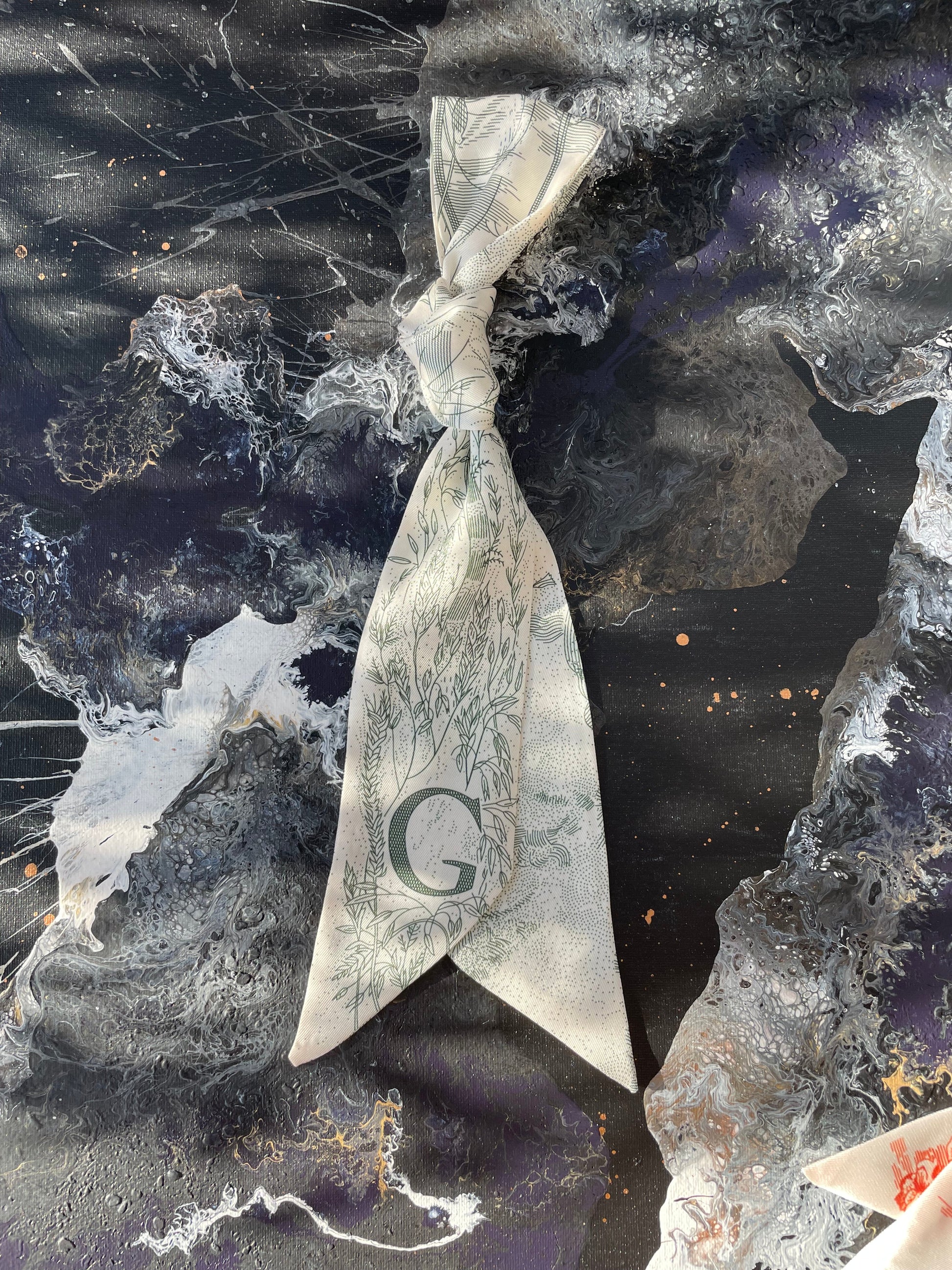 TWILLY, elongated shape, pointy ends, finished with an initial. Perfect little fashion accessory to wrap around the handle of your handbag, tie it around the neck Parisian style or just make a pretty bow. Whimsical art design in green.