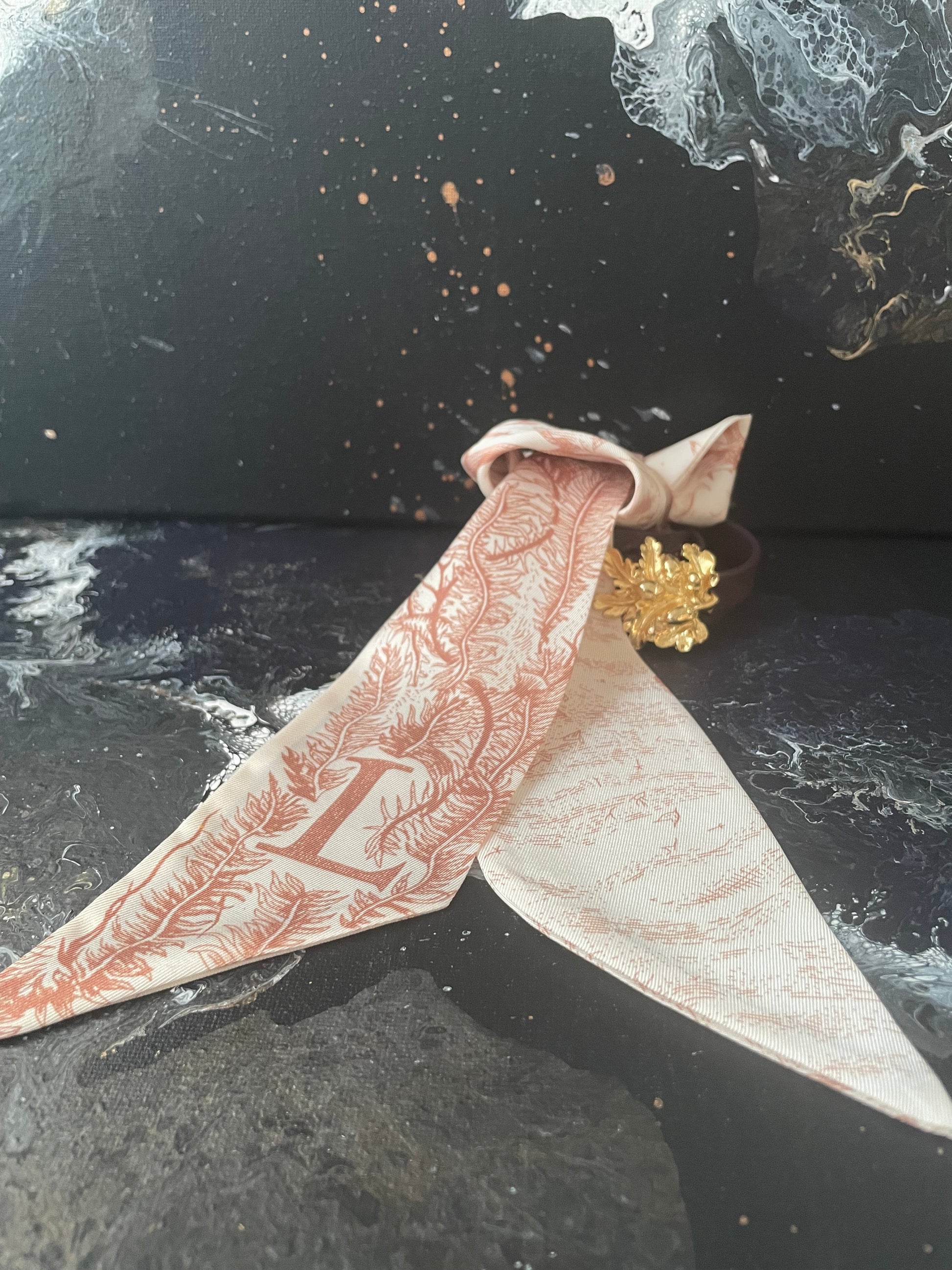 TWILLY, elongated shape, pointy ends, finished with an initial. Perfect little fashion accessory to wrap around the handle of your handbag, tie it around the neck Parisian style or just make a pretty bow. Whimsical art design in reddish orange.