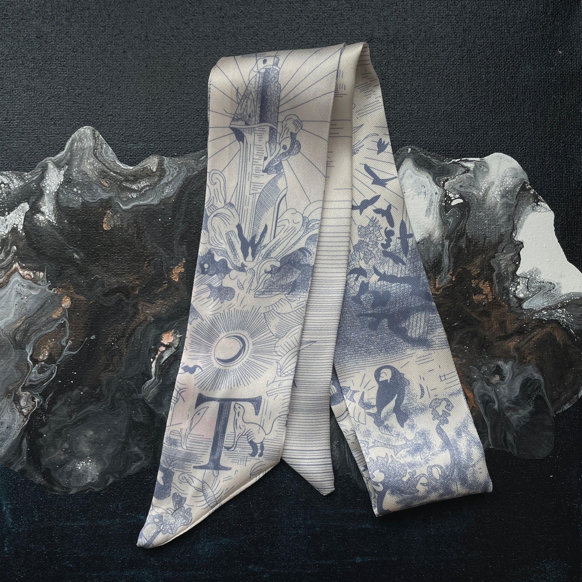 TWILLY, elongated shape, pointy ends, finished with an initial. Perfect little fashion accessory to wrap around the handle of your handbag, tie it around the neck Parisian style or just make a pretty bow. Whimsical art design in blue.