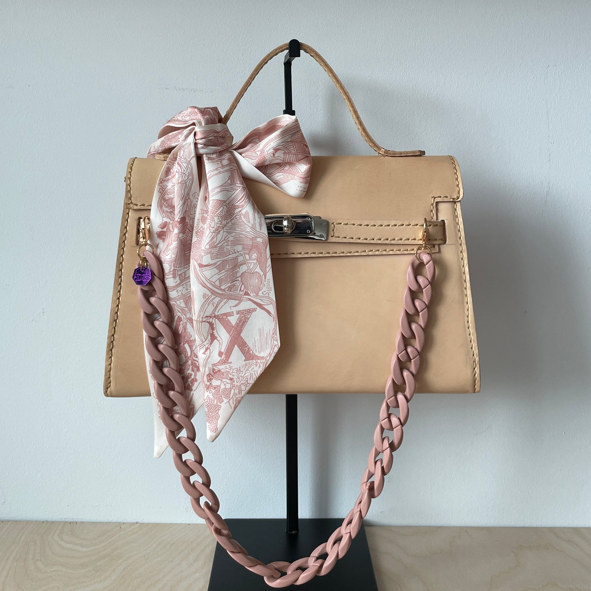 TWILLY, elongated shape, pointy ends, finished with an initial. Perfect little fashion accessory to wrap around the handle of your handbag, tie it around the neck Parisian style or just make a pretty bow. Whimsical art design in pink.