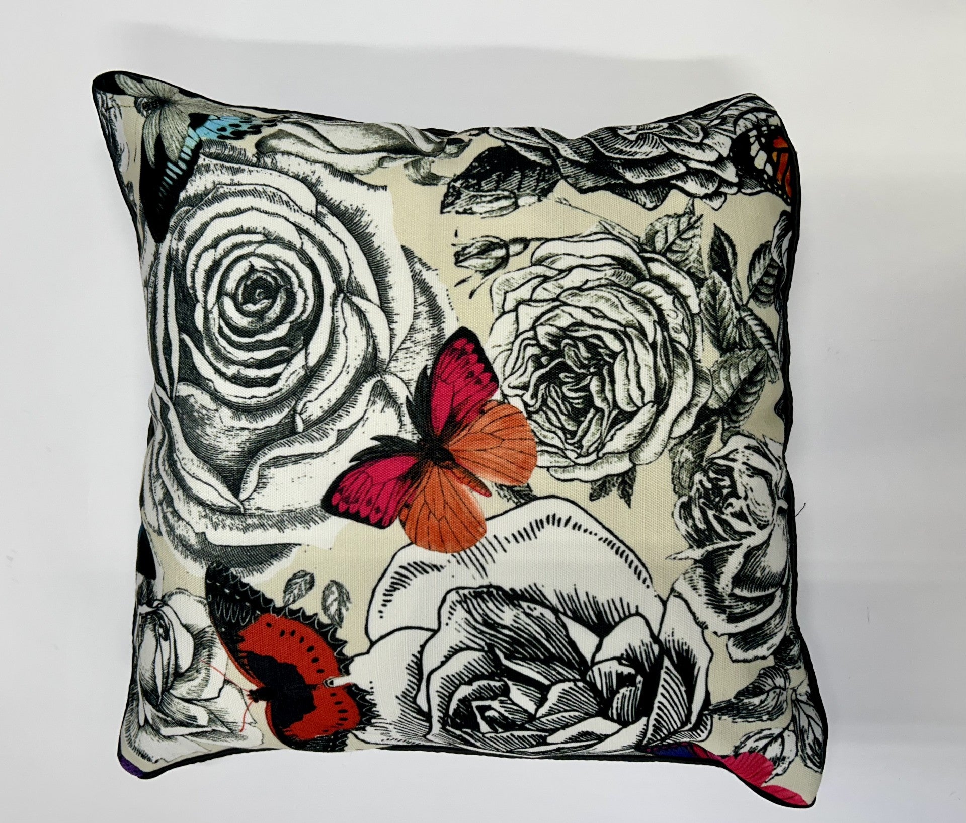Front: Multicolored butterflies on monochrome colored roses